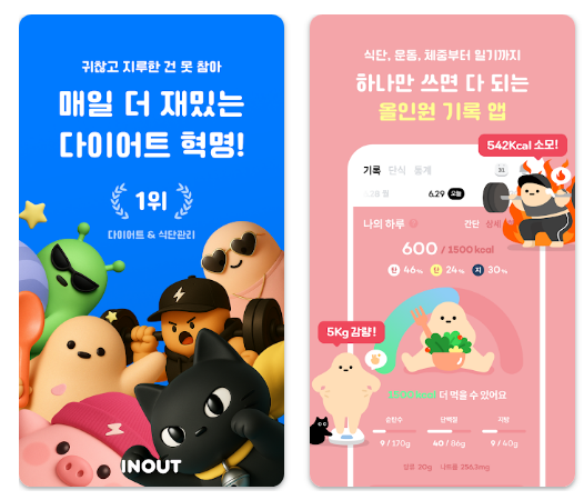 인아웃앱은 식단, 운동, 체중 기록을 한 곳에서 관리할 수 있는 다이어트 일기 앱입니다. 자동 칼로리 계산과 AI 코칭 기능으로 개인 맞춤 식단과 운동 계획도 제공합니다.
