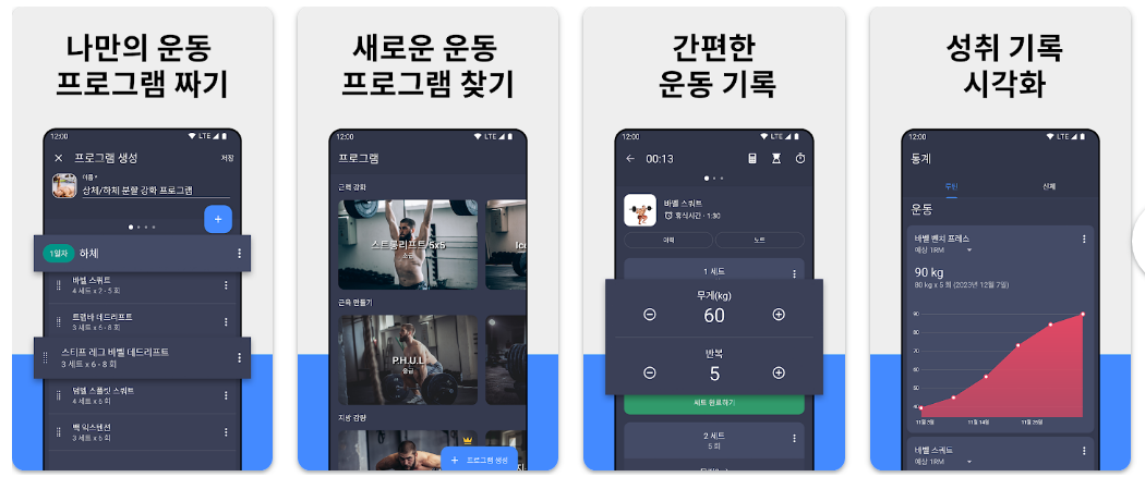 기록된 데이터를 바탕으로 사용자의 성장을 시각화하는 데 강점을 가지고 있습니다. 종목별 성장 차트와 캘린더 기능을 통해 운동 내역을 한눈에 파악할 수 있으며 친구들과 루틴을 공유하거나 다른 사용자의 루틴을 내 일지로 가져오는 커뮤니티 기능을 통해 운동의 재미를 높여줍니다.