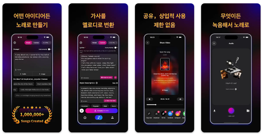 다양한 음악 스타일을 제공하여 취향에 맞는 곡을 완성하며 소셜 미디어에 최적화된 결과물을 만듭니다. 제작된 노래는 고음질로 저장되어 개인 소장 및 공유가 용이하며 영감을 빠르게 실체화합니다.