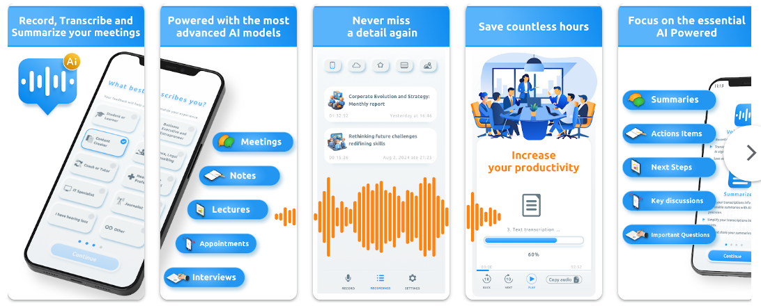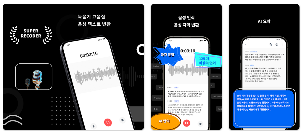 고음질 녹음 기능과 강력한 텍스트 변환을 결합한 다기능 녹음기 앱입니다. 회의, 인터뷰 등 다양한 상황에서 선명한 녹음을 지원하며 이를 즉각 문자로 전환해 관리합니다.