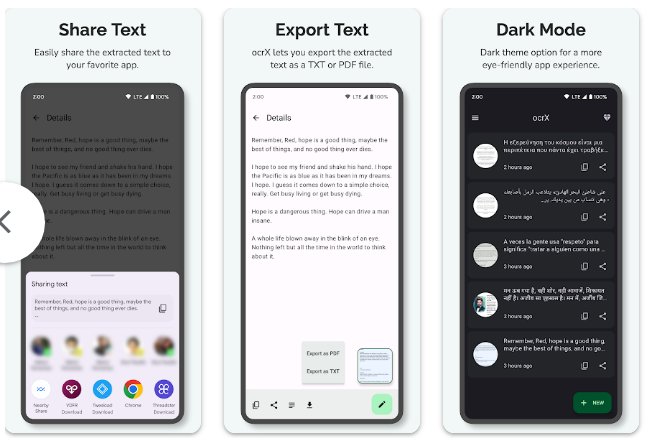 또한 다양한 언어를 자동으로 인식하는 기능이 포함되어 있으며, 추출된 텍스트를 복사하거나 편집, 공유까지 이어지는 작업 흐름을 지원하는 것이 특징입니다. 기본적인 OCR 기능 외에도 스캔 기록 저장, 다크 모드 등 사용자 편의 기능이 함께 제공됩니다.