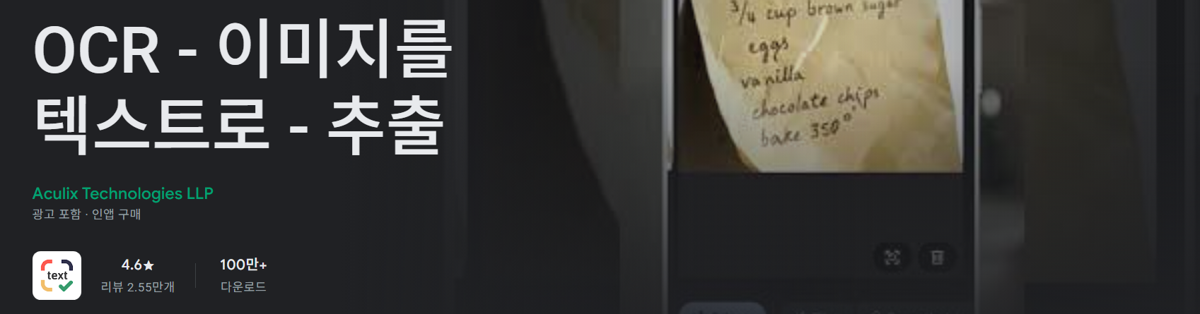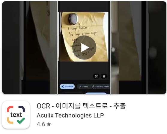 이 앱은 이미지 속 글자를 자동으로 인식하여 텍스트로 변환하는 OCR 기능을 중심으로 제공되는 모바일 애플리케이션입니다. 머신러닝 기반 텍스트 인식 기술을 활용해 사진이나 문서 이미지에서 문자를 빠르게 추출할 수 있도록 설계되어 있습니다.
