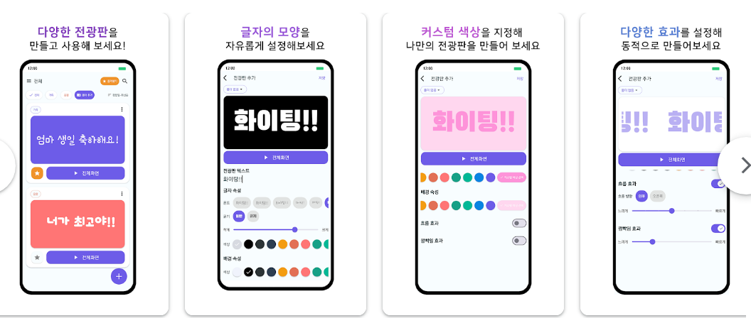 다양한 폰트와 효과로 개성 있는 전광판을 만드는 앱입니다. 여러 문구를 순차적으로 보여주는 자동 릴레이 기능이 있어 긴 메시지 전달 시 유용합니다.
