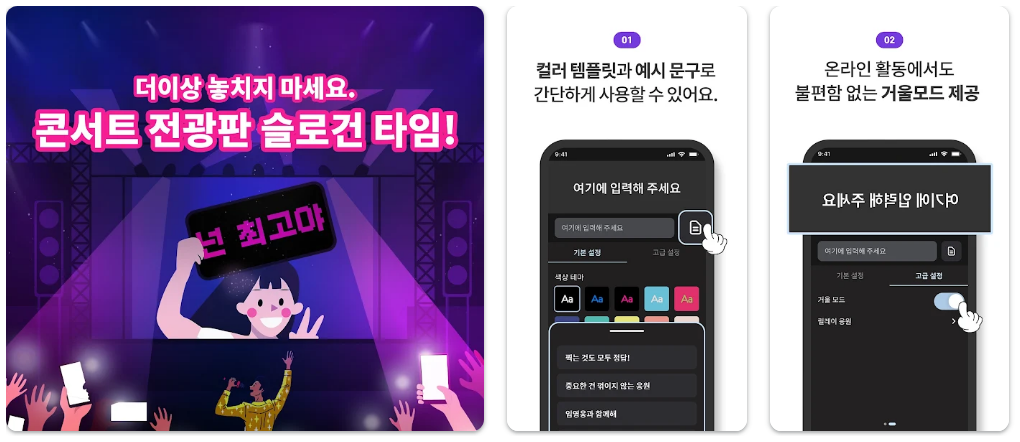 복잡한 설정 없이 누구나 쉽게 사용하도록 제작된 응원 도구입니다. 입력한 문구를 화면에 꽉 차게 표시하여 콘서트나 경기장에서 효율적인 의사전달을 돕습니다.