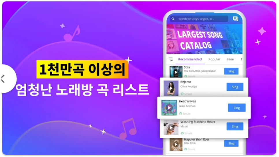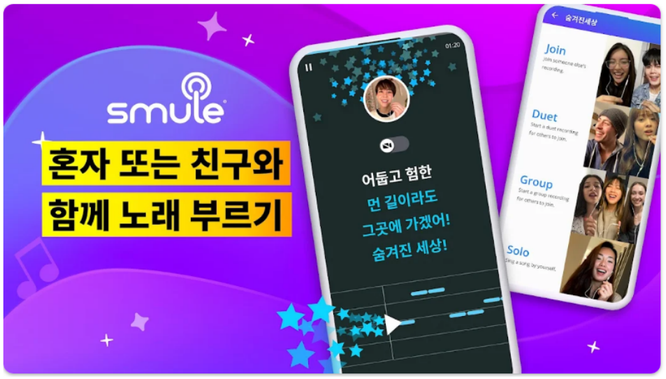 Smule은 세계적으로 유명한 노래방 앱으로, 1천만 곡 이상의 방대한 라이브러리를 보유하고 있습니다. 다양한 장르의 음악을 언제 어디서나 부를 수 있으며, 솔로, 듀엣, 그룹으로 참여해 창의적인 콘텐츠를 만들 수 있습니다.