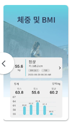 체중과 BMI를 기록하고 관리하는 기능이 포함되어 있어 체중 변화와 건강 상태를 함께 확인할 수 있습니다. 사용자가 목표 체중이나 BMI 범위를 설정하면, 앱이 변화 추이를 분석하여 건강 관리 계획을 세우는 데 도움을 줍니다.